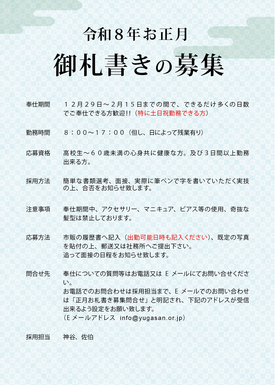 令和8年 お正月 御札書きの募集