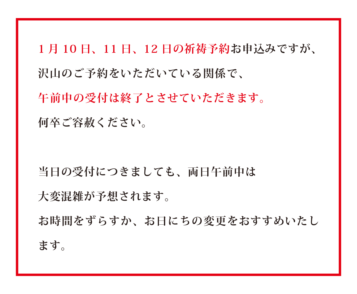 【重要】令和8年1月10日、11日、12日午前中の祈祷予約は満員の為 終了いたしました